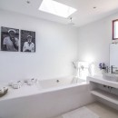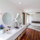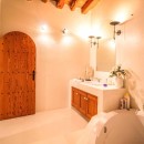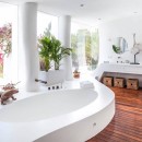 The guest accommodation at Estrella Azul is spread across the main house and a separate casita overlooking the pool. In the casita, the master suite awaits, an opulent sanctuary adorned in serene white tones. The suite features a curved seating area that opens onto a private terrace. Upstairs, a mezzanine level is dominated by a striking oval king-size bed and a suspended feature fireplace at one end. The master en-suite is equally impressive, boasting a vast oval bathtub offering tropical garden views.