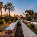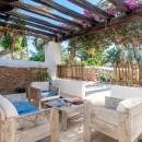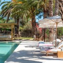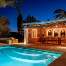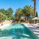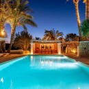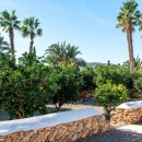 The generously sized pool (16m x 6m), equipped with a saltwater system for skin and hair-friendly enjoyment, is a striking feature of the property. Nestled amidst a charming orchard of citrus, olive trees, and palms, the lavish pool area offers shaded outdoor dining, a spacious terrace with eight sun loungers for relaxation, and a daybed positioned at the pool's end, providing a perfect vantage point for admiring the sunset skies. Abundant foliage ensures privacy across the expansive 8000m² plot, offering cool respite on warm summer days.