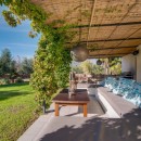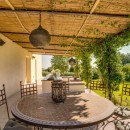 Another terrace, adorned with charming vines that drape over its thatched roof, hosts an expansive outdoor lounge. This space features a circular dining table and a comfortable chill-out zone—ideal for unwinding while delectable treats sizzle on the premium gas barbecue also situated here. Exterior speakers affixed to the side of the villa grant you the pleasure of musical accompaniment during al fresco dining.