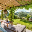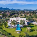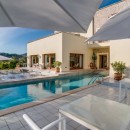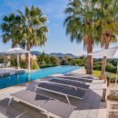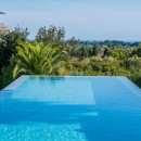 Stretching 25 meters in length, the infinity pool seamlessly blends with the lush garden. From this vantage point, you're treated to breathtaking vistas that span from the landscape down to the sea. The panorama includes a picturesque array of palm and olive trees, fragrant lavender bushes, and stately cypresses. Access to the graduated pool is offered either through steps adjacent to the villa or via a ladder on one side. On the extensive terraces encircling the pool, you'll discover multiple sun loungers, shading parasols, inviting seating enclaves, and a generously sized table perfect for communal gatherings and relaxation.