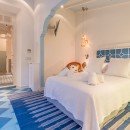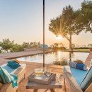 The four bedrooms include three with double beds, high end entertainment systems, dressing rooms and large, ensuite baths. A fourth features two single beds and a dressing room along with private bath. Each of the bedrooms has sea views or direct terrace access.