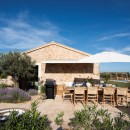 Additionally, three separate apartments on the entry level come equipped with modern kitchens and spacious ensuite bedroom suites. The lower floor features an entertainment room, a creative workspace, a conference room, and additional storage and laundry facilities, alongside another spacious bedroom suite. Expansive stairways ensure smooth movement between levels. Surrounding the villa, large terraces, beautiful patios, and a hidden cactus and olive garden with a waterfall fountain, BBQ fireplace, and serene water pond enhance the property’s charm. The finca’s architecture seamlessly integrates indoor and outdoor spaces, promoting a deep connection with nature while ensuring privacy and comfort.
