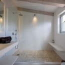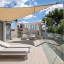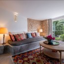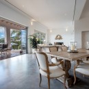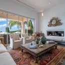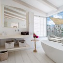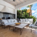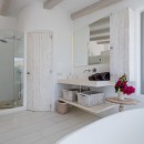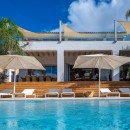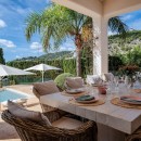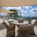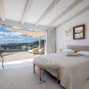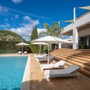 The villa accommodates up to 10 guests in its five bright, airy bedrooms spread over two floors. Each bedroom includes an en-suite bathroom with luxurious pebble-floor rainfall showers, while one features an outdoor soaking tub with scenic views. Some bedrooms open to sun-kissed terraces, offering loungers and shaded spots to enjoy the serene panoramas.