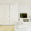 On the lower level, you'll discover two bedrooms, while the upper floor leads to three more bedrooms—each graced with an en-suite bathroom, blackout blinds, and ample storage provided by built-in wardrobes, cabinets, and drawers. Discreetly mounted within the wardrobe of two master bedrooms—one on each floor—is safe for your valuables.