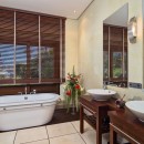 Bedroom 2: Bedroom with a king-size bed, A/C, WiFi, terrace with access to the pool, and en-suite bathroom with bathtub, shower, double vanity and WC. 2 guests maximum