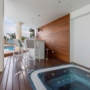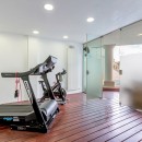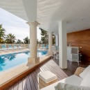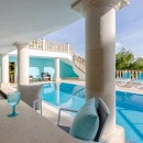 The outdoor space is designed for ultimate relaxation, featuring a mosaic-tiled pool surrounded by cushioned loungers and Bali beds. A covered terrace hosts a jacuzzi and bar, while the nearby fitness room, steam room, and Finnish sauna provide options for unwinding or staying active. Additional amenities include a changing area with a separate shower and bathroom, as well as a private outdoor shower near the sauna and steam room.