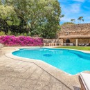 The pool terrace is a true haven, surrounded by vibrant bougainvillea and lush lawns. Relax on sunbeds, unwind in shaded lounge areas, or take a refreshing dip in the inviting pool. Inside, a cozy living room with a large flat-screen satellite TV and integrated sound system offers the perfect spot to relax after a day of exploration.