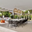 The villa offers additional living spaces outdoors, including terraces by the pool and an expansive roof terrace perfect for enjoying sunsets with loved ones. Dining options abound, whether indoors at the 12-seater table or alfresco on the terrace, with the sleek Modulnova kitchen facilitating effortless meal preparation and conversation.