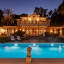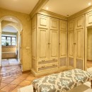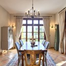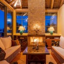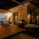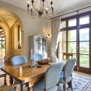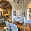 Upon entering the courtyard, you'll encounter a serene fountain and an impressive entrance leading to the hallway and lounge, featuring an inviting open log fireplace. The transition from the lounge to the distinct dining room, where patio doors open to an outdoor seating area, ideal for year-round al fresco dining.