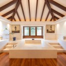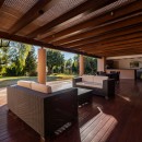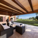 The expansive living room showcases wooden beam ceilings and opens onto the covered terrace, while a separate dining area adds to the grandeur. The fully equipped gourmet kitchen, outfitted with Wolf appliances celebrated for their legendary professional pedigree, adds a touch of culinary distinction.