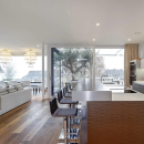 Spanning three levels, the exclusive penthouse features a stunning rooftop terrace equipped with sun loungers, a cozy lounge area, a barbecue, and a fireplace—ideal for entertaining while soaking in panoramic views of the lake and the Alps. The upper living floor boasts a spacious living and kitchen area, complete with a dining table for up to ten guests. Here, you’ll find various wooden decks where you can unwind with a cocktail or enjoy a relaxing soak in the jacuzzi.